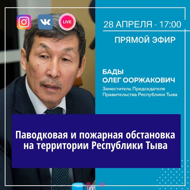 28 апреля, в 17:00 Прямой эфир Заместителя Председателя Правительства Республики Тыва О.О. Бады.